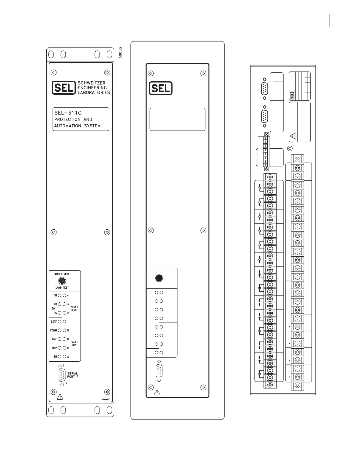 Figure 2.3 SEL-311C Front- and Rear-Panel Drawings—Models 0311C00V1 (Rack) and 0311C0041 (Panel)