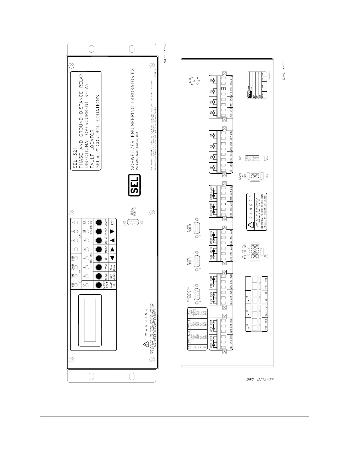 Figure 6.11: SEL-321 Relay Horizontal Front and Rear Panel Drawings