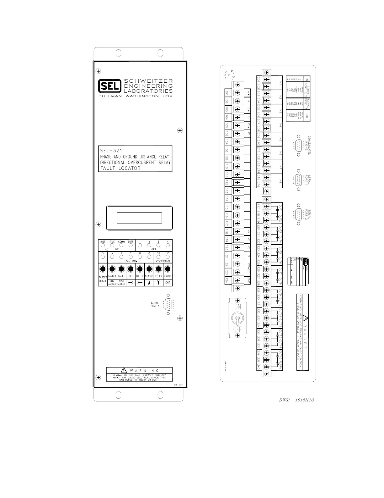 Figure 6.6: SEL-321 Relay Vertical Front and Rear Panel Drawings