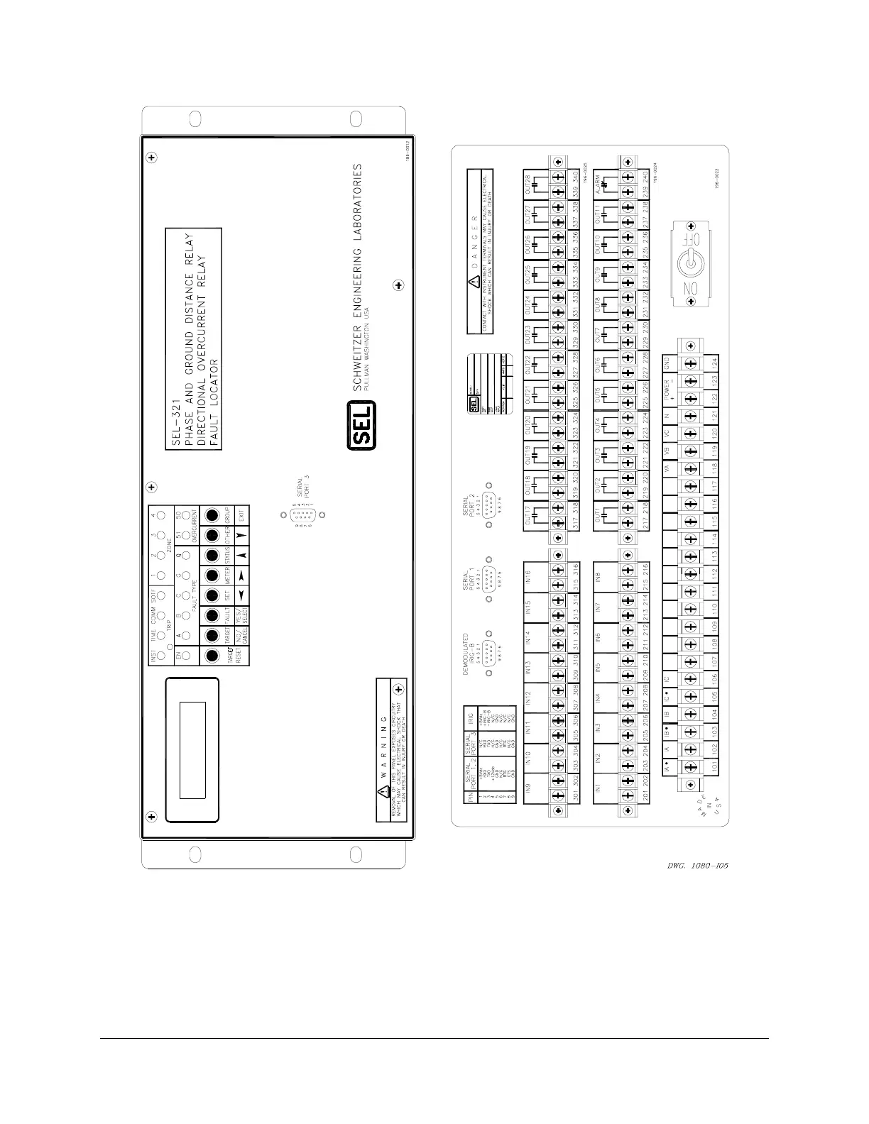 Figure 6.7: SEL-321 Relay Horizontal Front and Rear Panel Drawings