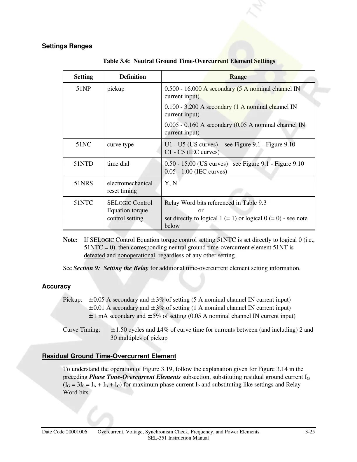 Table 3.4: Neutral Ground Time-Overcurrent Element Settings
