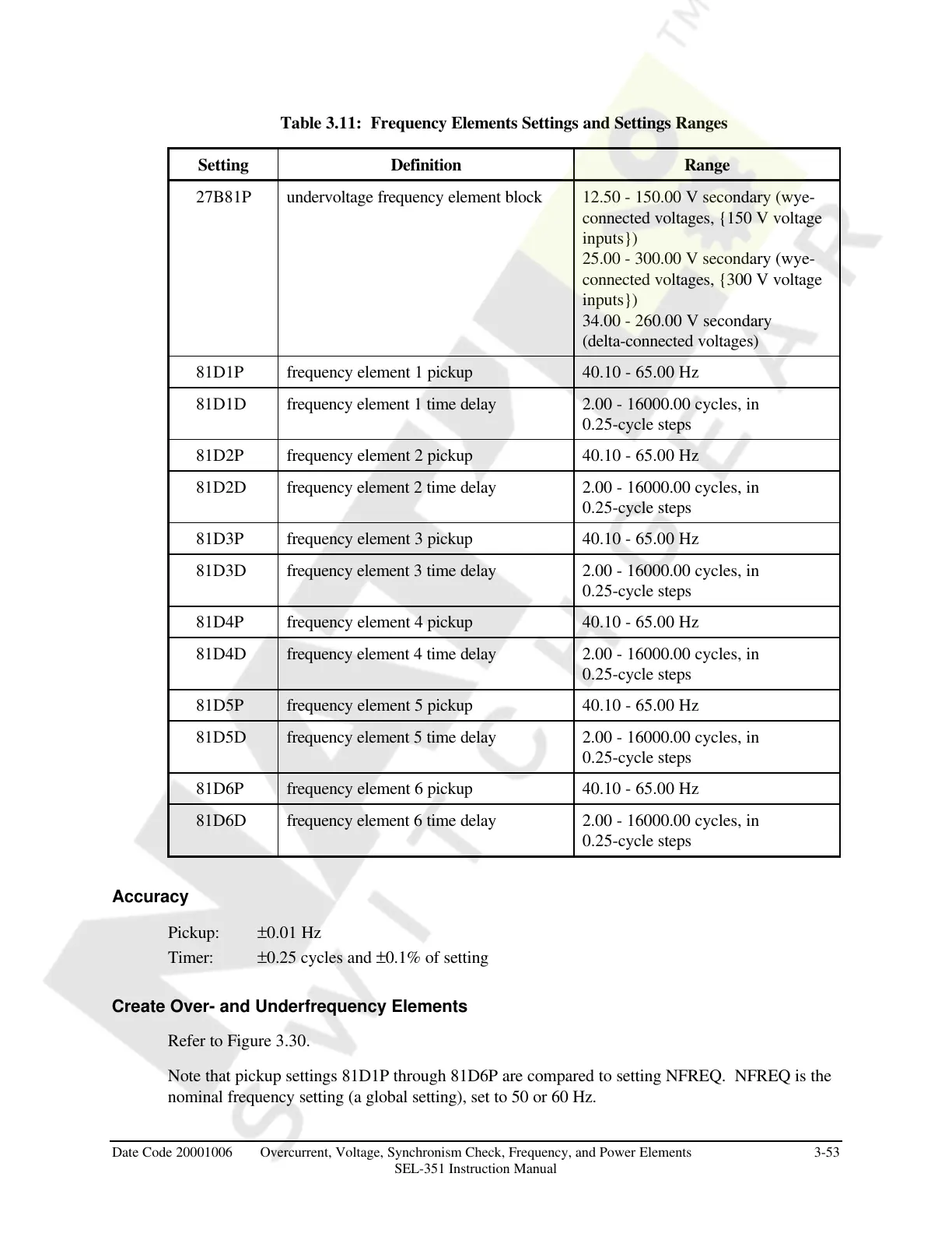 Table 3.11: Frequency Elements Settings and Settings Ranges