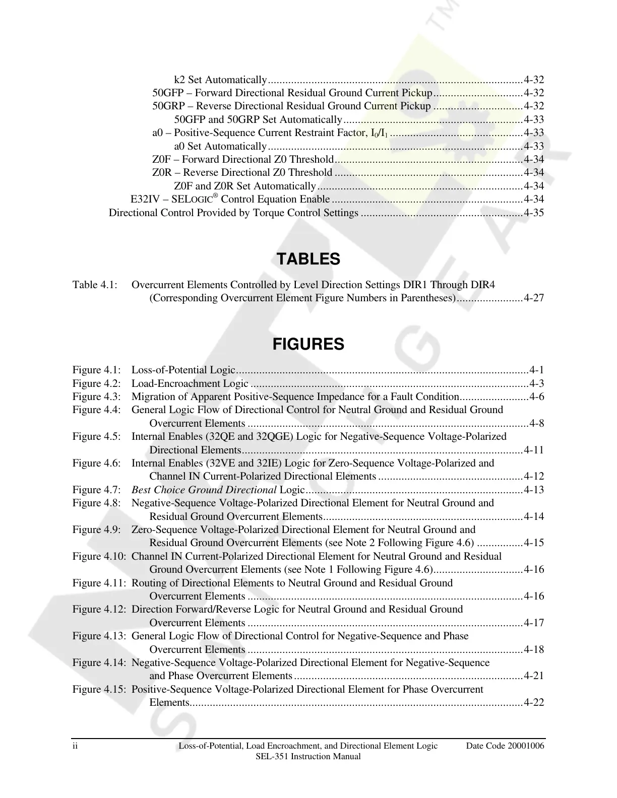 Residual Ground Overcurrent Elements (see Note 2 Following Figure 4.6) ................4-15