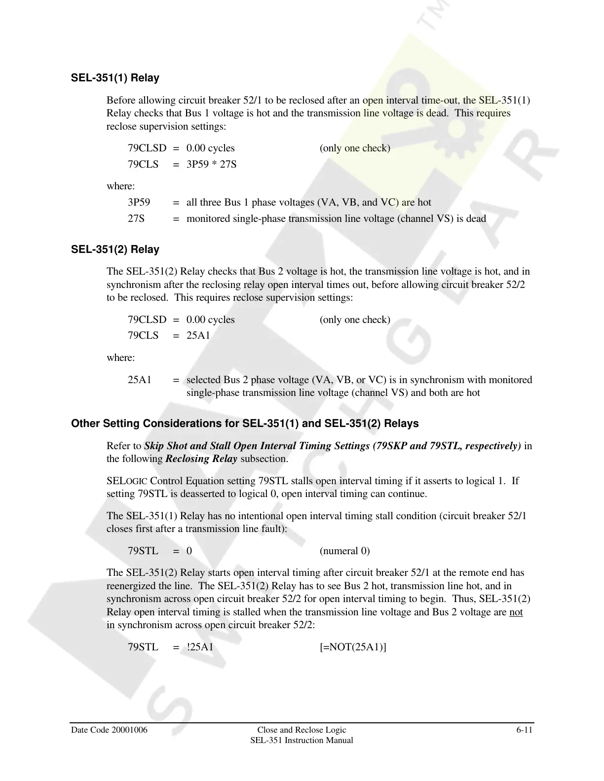 Before allowing circuit breaker 52/1 to be reclosed after an open interval time-out, the SEL-351(1)