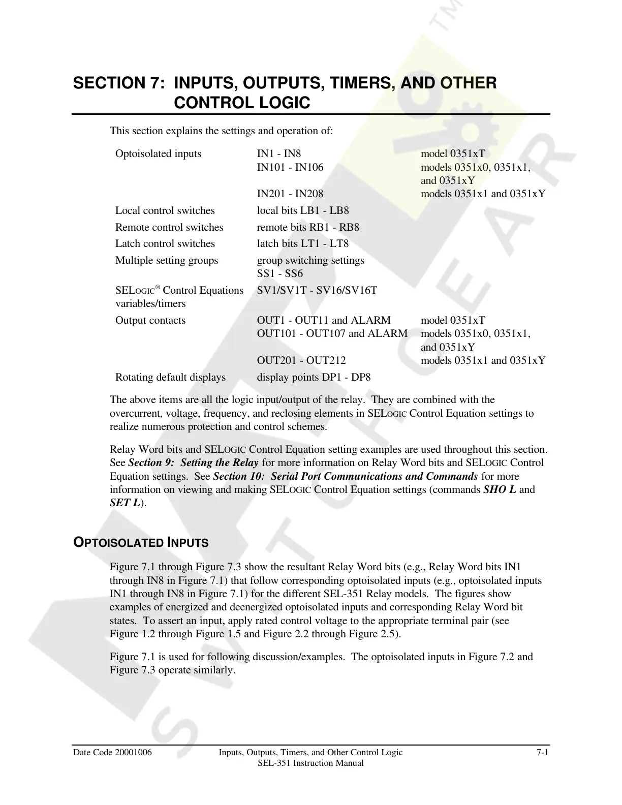 Date Code 20001006 Inputs, Outputs, Timers, and Other Control Logic 7-1