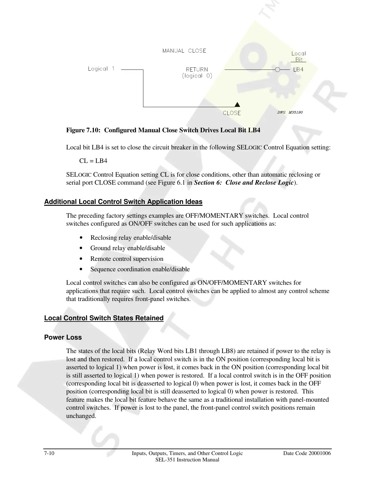 is still asserted to logical 1) when power is restored. If a local control switch is in the OFF position