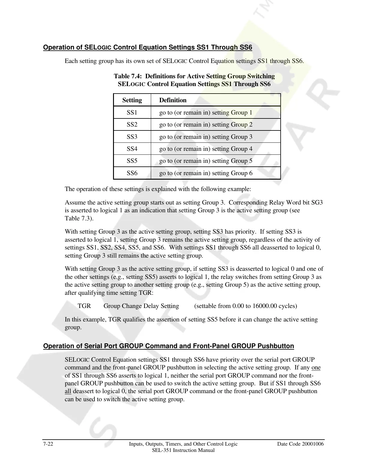 SELOGIC Control Equation settings SS1 through SS6 have priority over the serial port GROUP