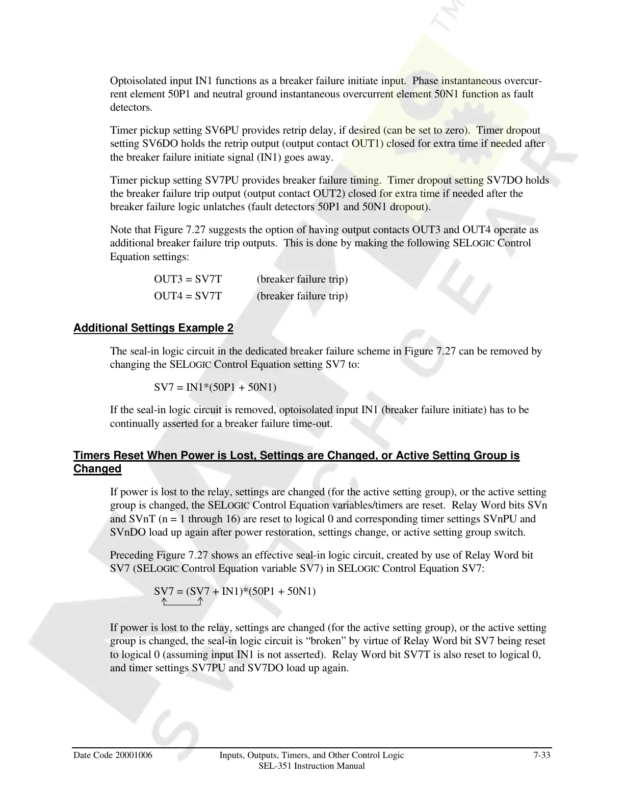 Timer pickup setting SV7PU provides breaker failure timing. Timer dropout setting SV7DO holds