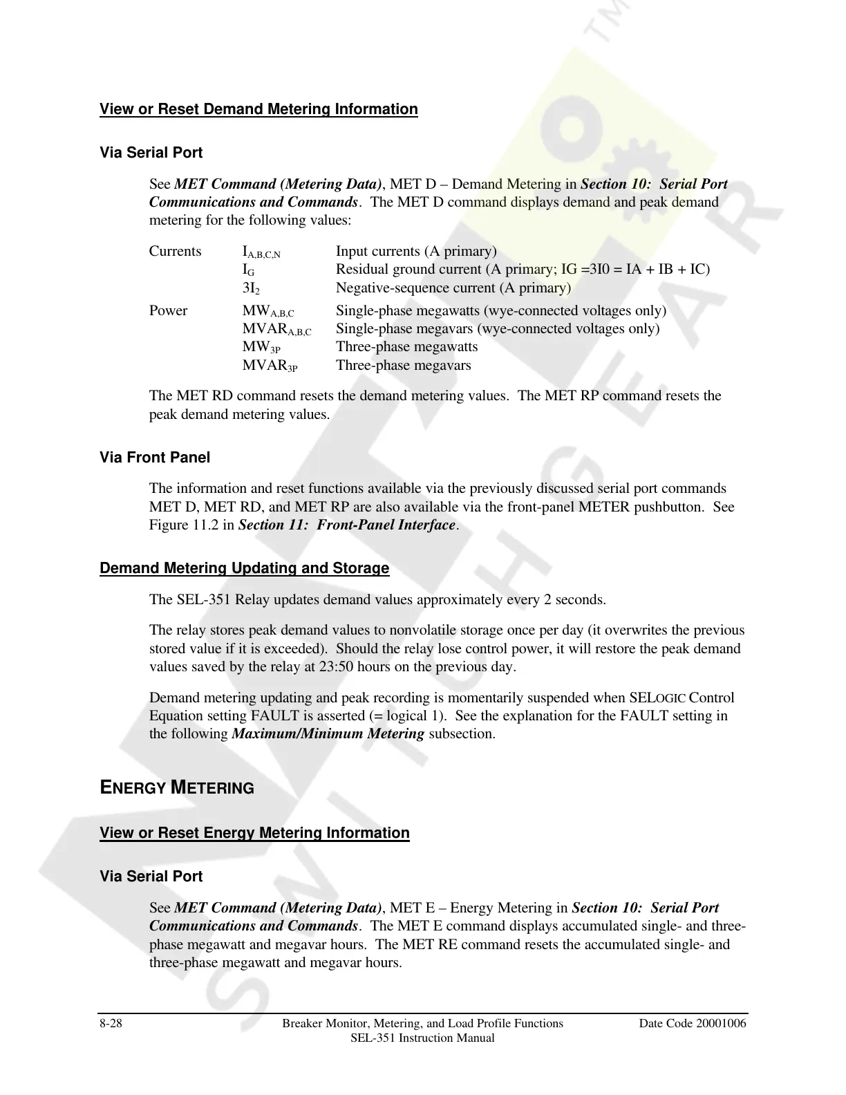 phase megawatt and megavar hours. The MET RE command resets the accumulated single- and