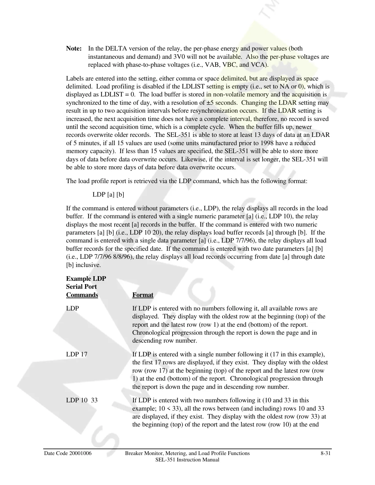 If the command is entered without parameters (i.e., LDP), the relay displays all records in the load
