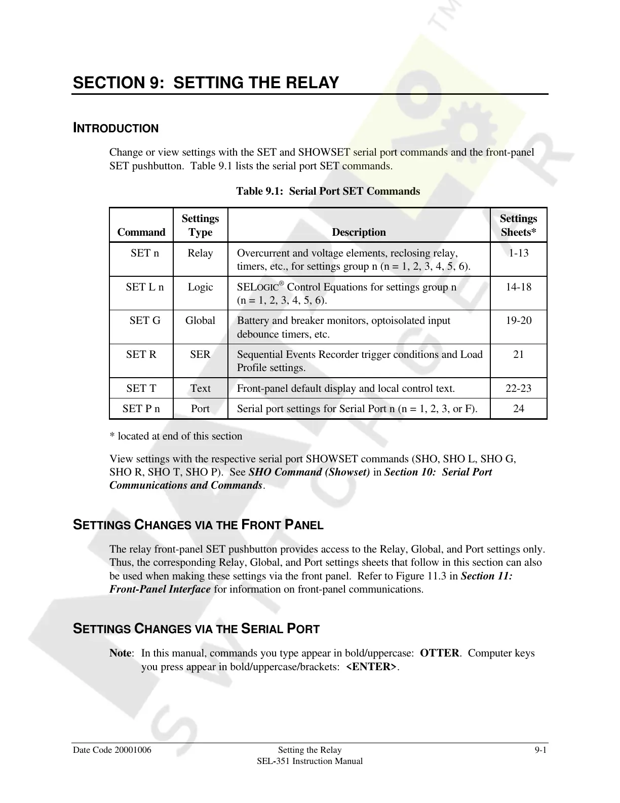 Date Code 20001006 Setting the Relay 9-1