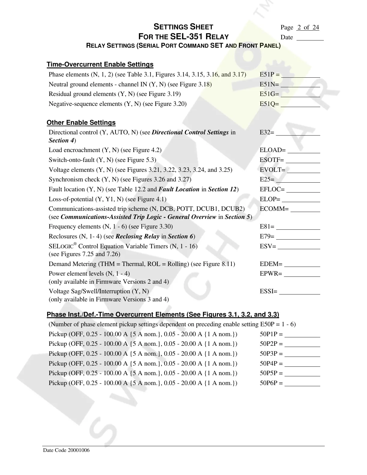 FOR THE SEL-351 RELAY Date