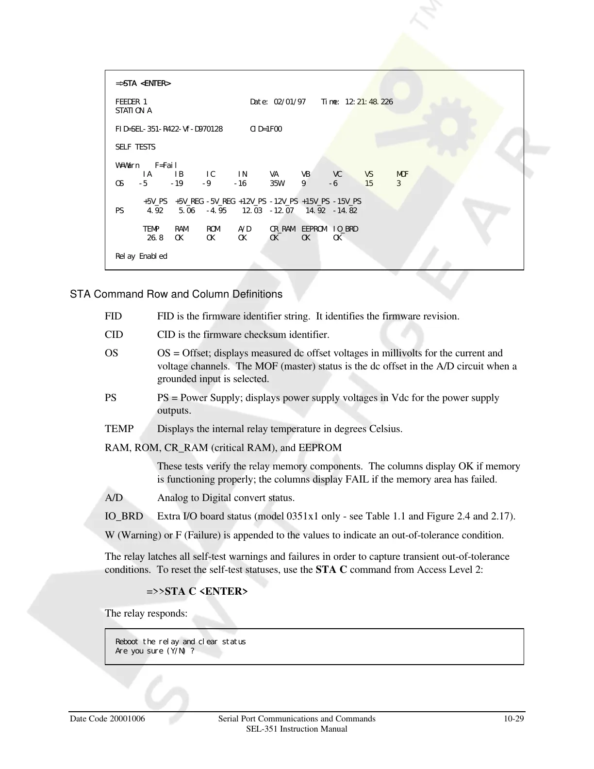 conditions. To reset the self-test statuses, use the STA C command from Access Level 2: