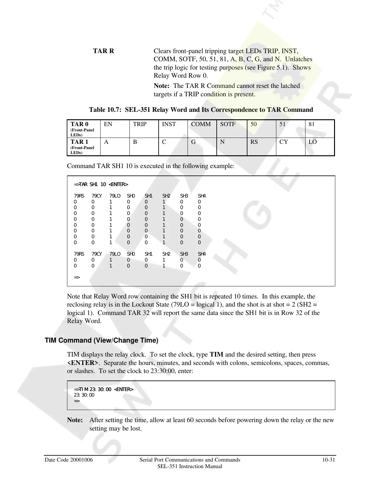 Table 10.7: SEL-351 Relay Word and Its Correspondence to TAR Command