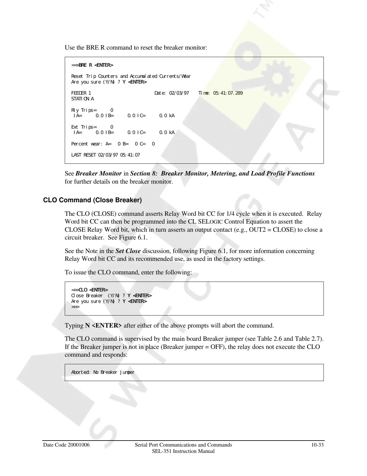 The CLO command is supervised by the main board Breaker jumper (see Table 2.6 and Table 2.7).