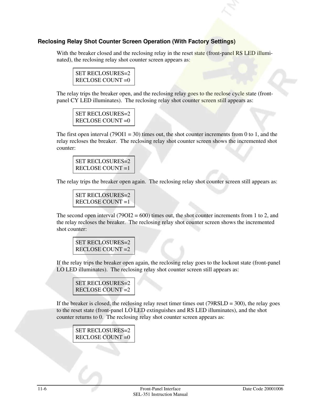 Reclosing Relay Shot Counter Screen Operation (With Factory Settings)