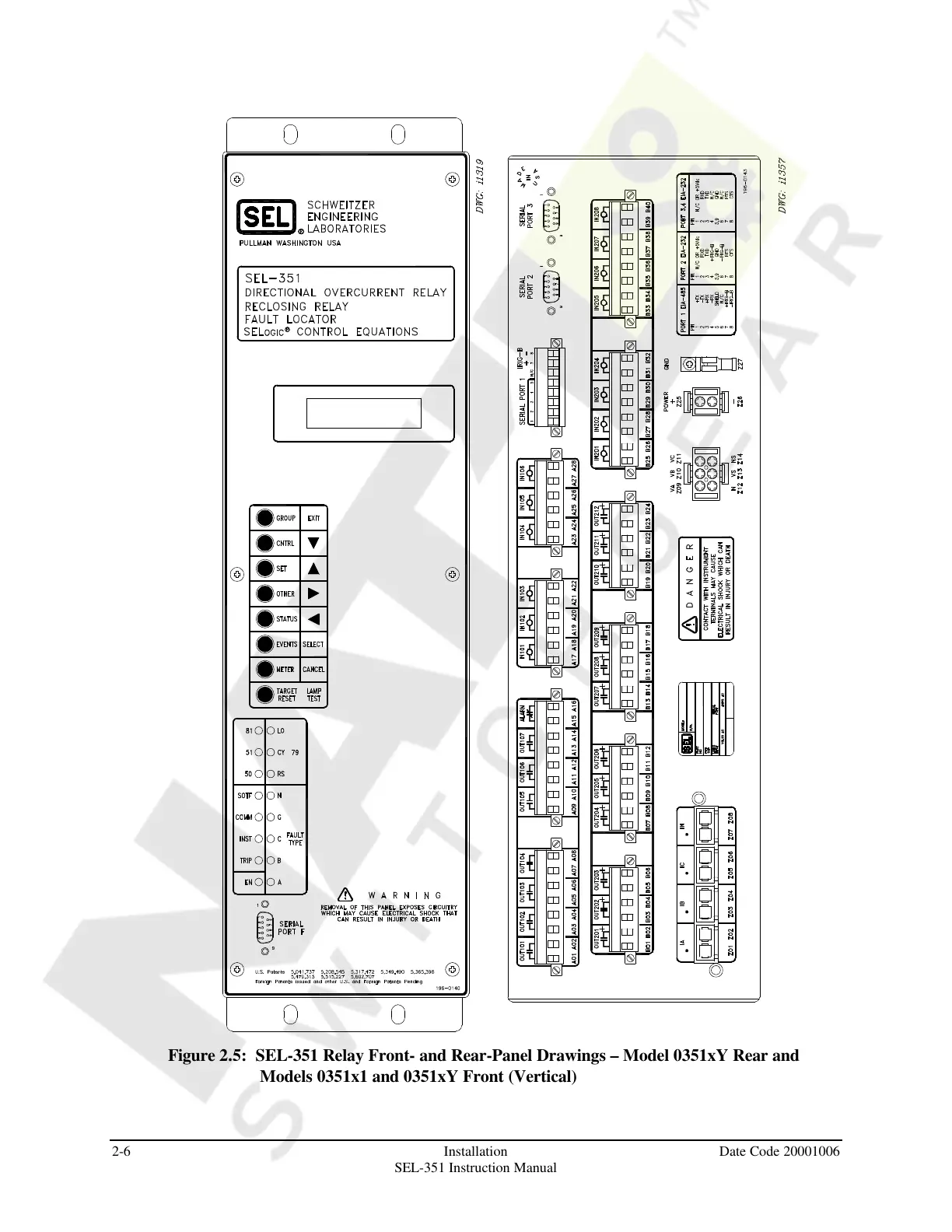 Figure 2.5: SEL-351 Relay Front- and Rear-Panel Drawings – Model 0351xY Rear and