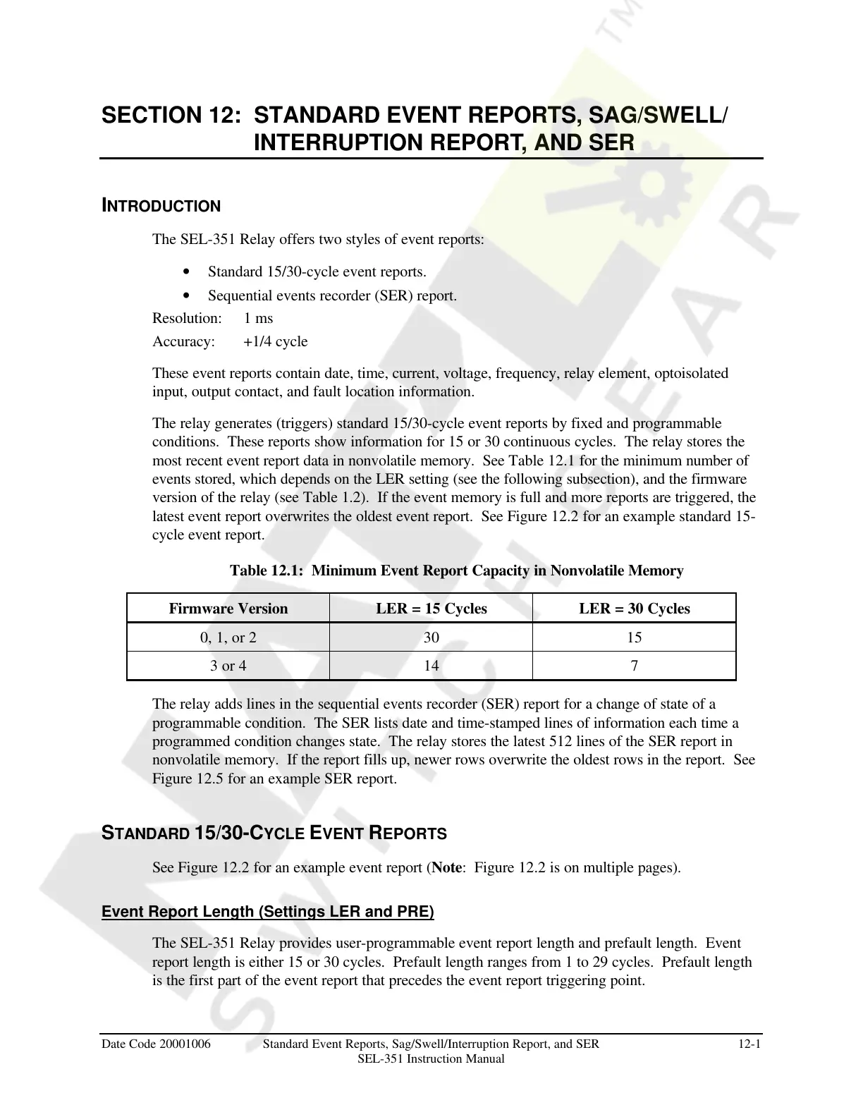 Date Code 20001006 Standard Event Reports, Sag/Swell/Interruption Report, and SER