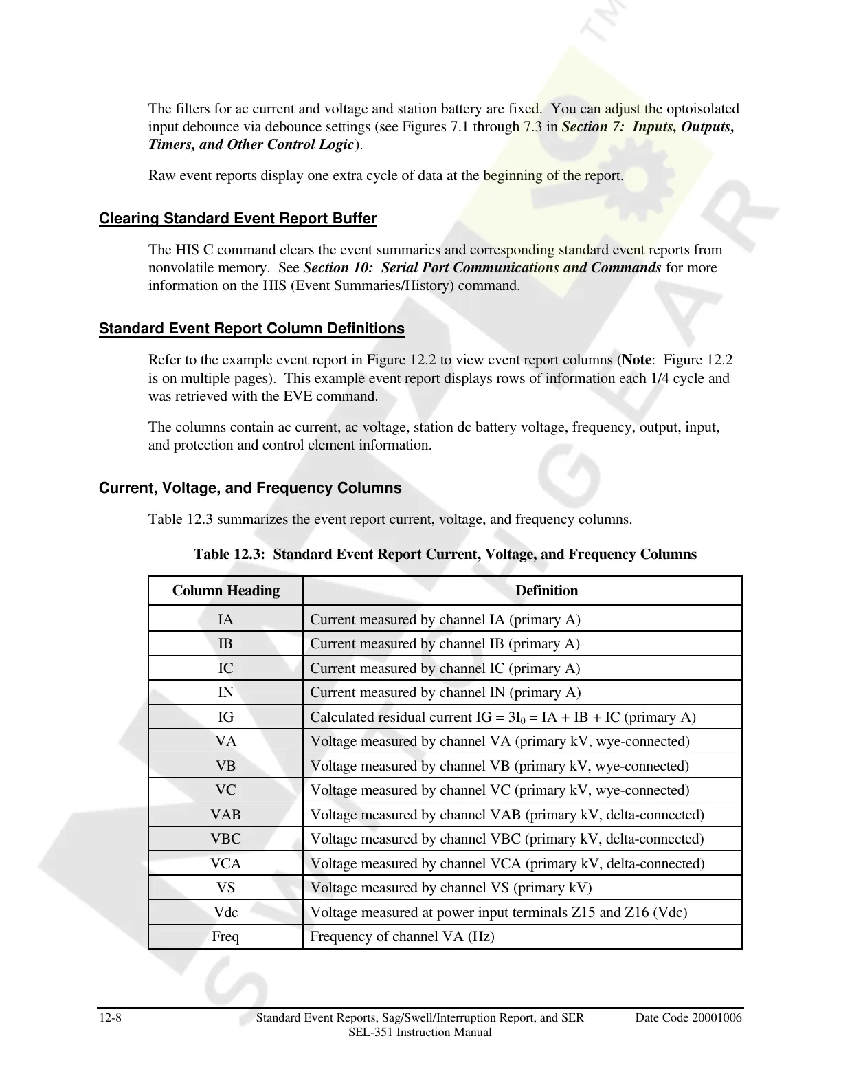 12-8 Standard Event Reports, Sag/Swell/Interruption Report, and SER Date Code 20001006