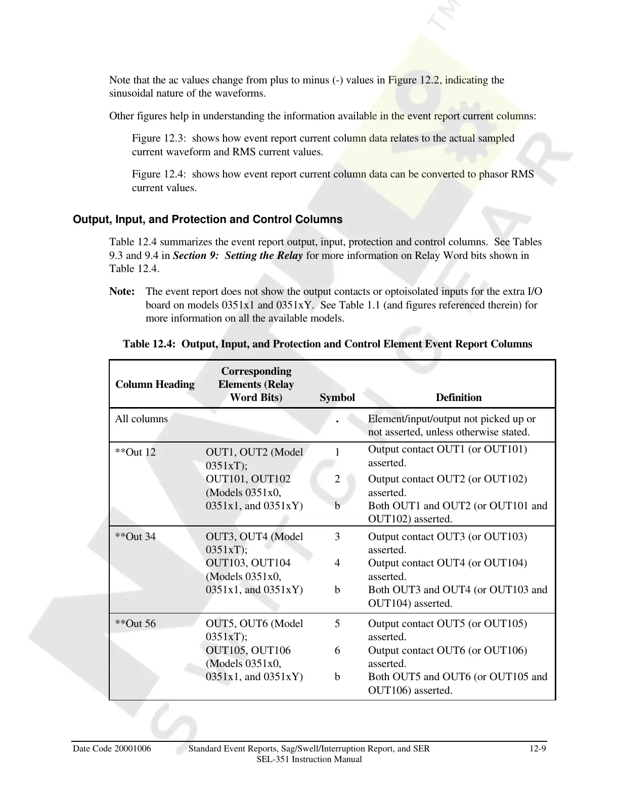 Table 12.4 summarizes the event report output, input, protection and control columns. See Tables