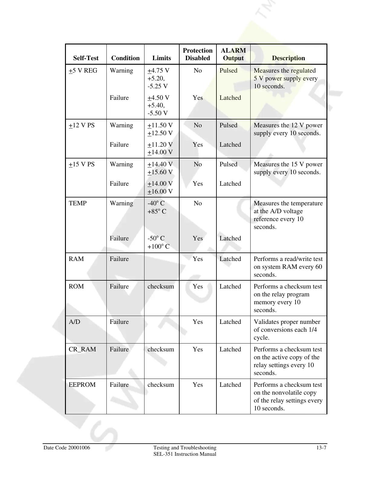 ROM Failure checksum Yes Latched Performs a checksum test