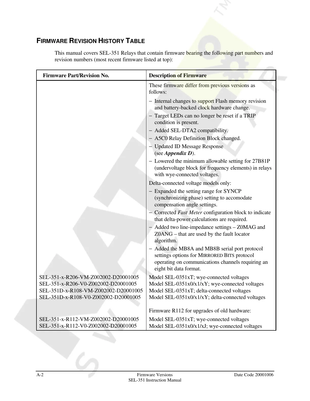 This manual covers SEL-351 Relays that contain firmware bearing the following part numbers and