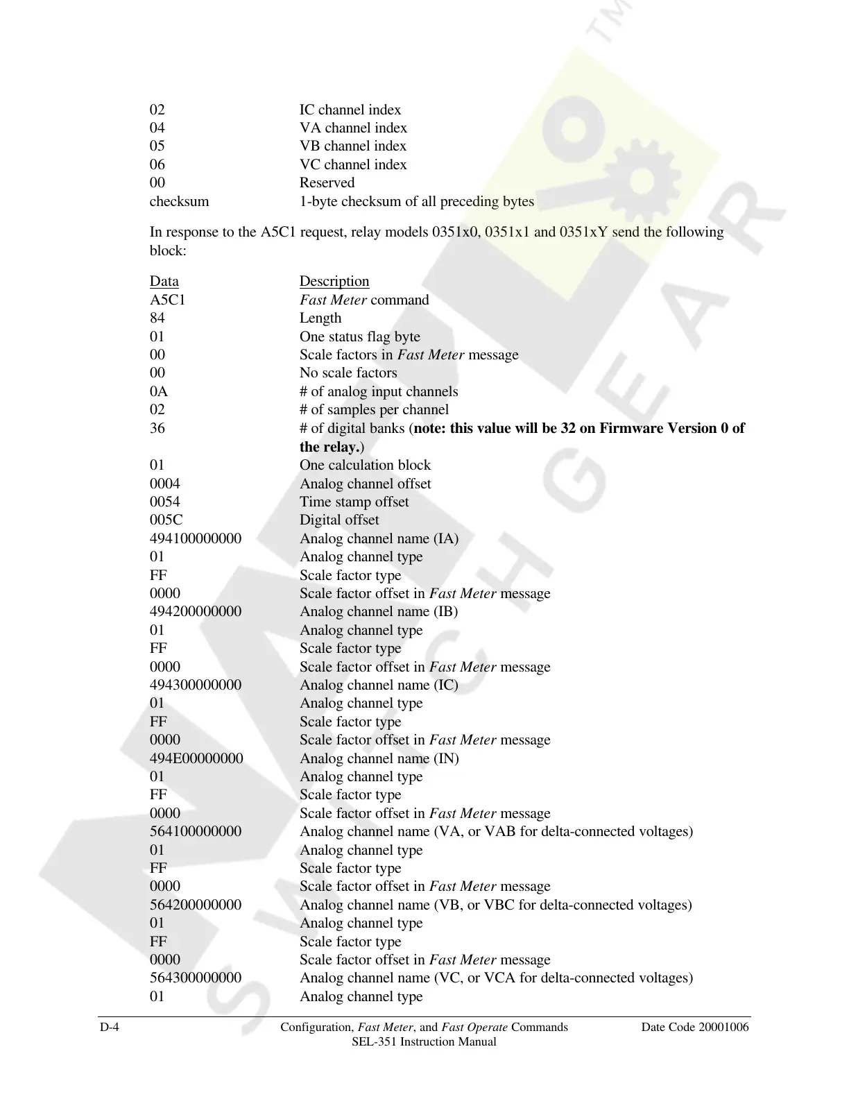 D-4 Configuration, Fast Meter, and Fast Operate Commands Date Code 20001006