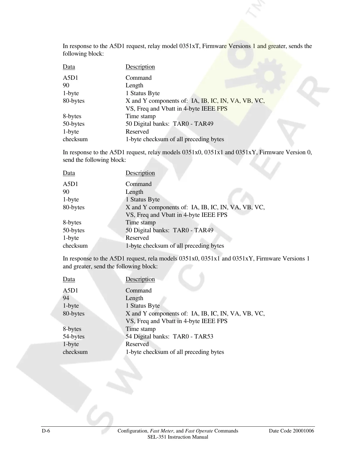 D-6 Configuration, Fast Meter, and Fast Operate Commands Date Code 20001006