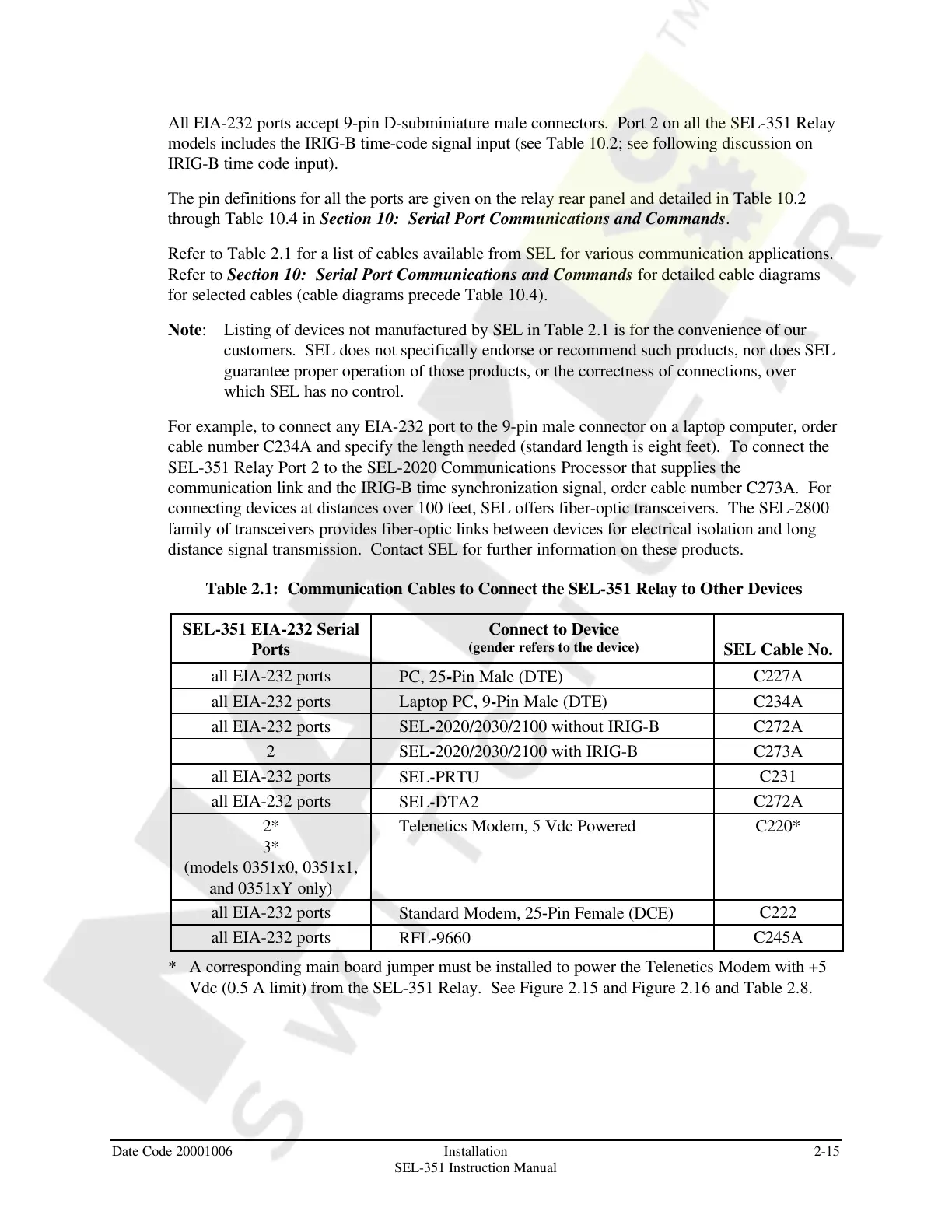 Refer to Table 2.1 for a list of cables available from SEL for various communication applications.