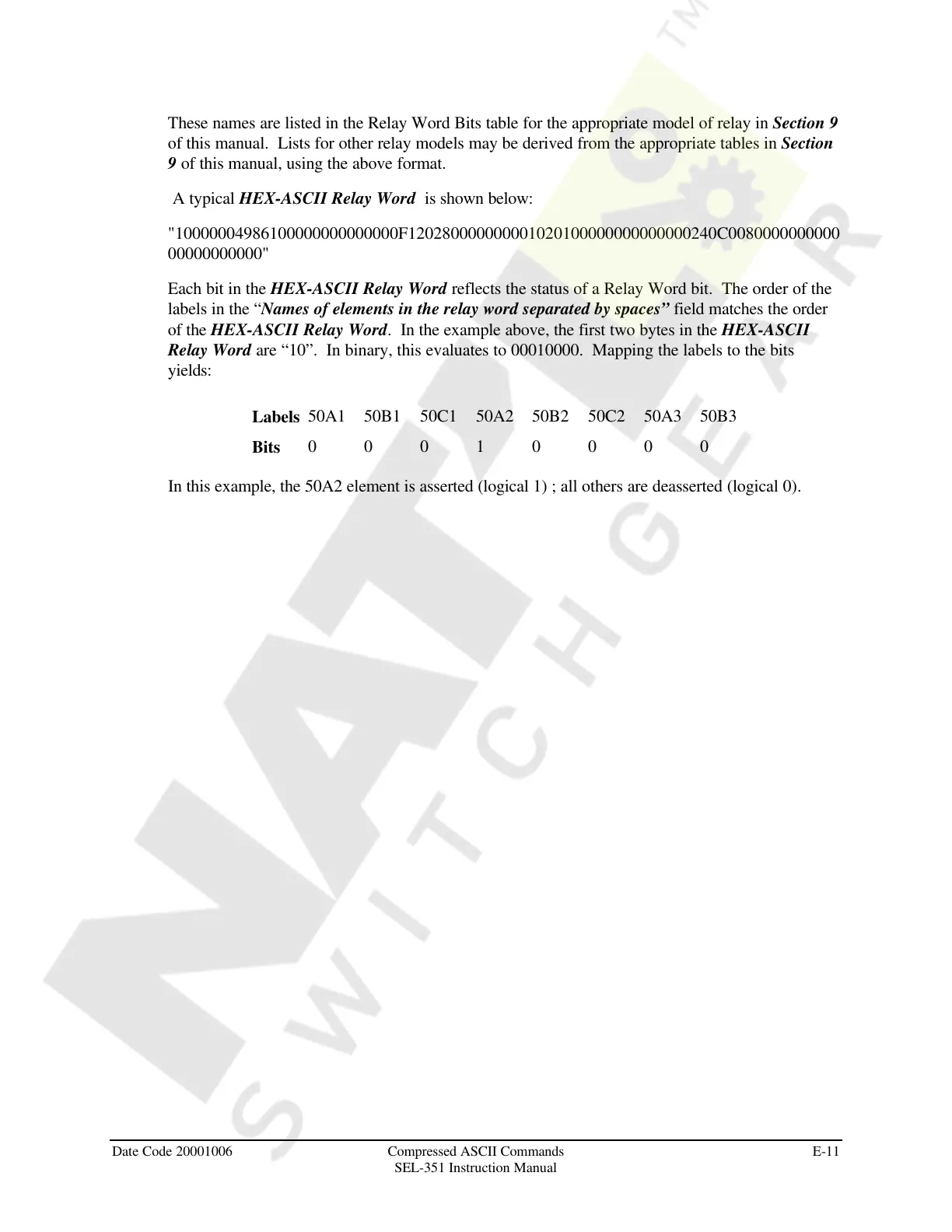 of the HEX-ASCII Relay Word. In the example above, the first two bytes in the HEX-ASCII
