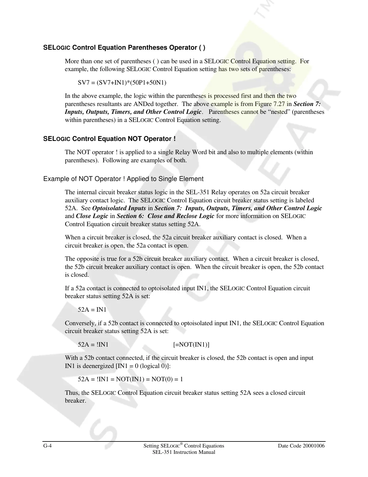 SELOGIC Control Equation NOT Operator !