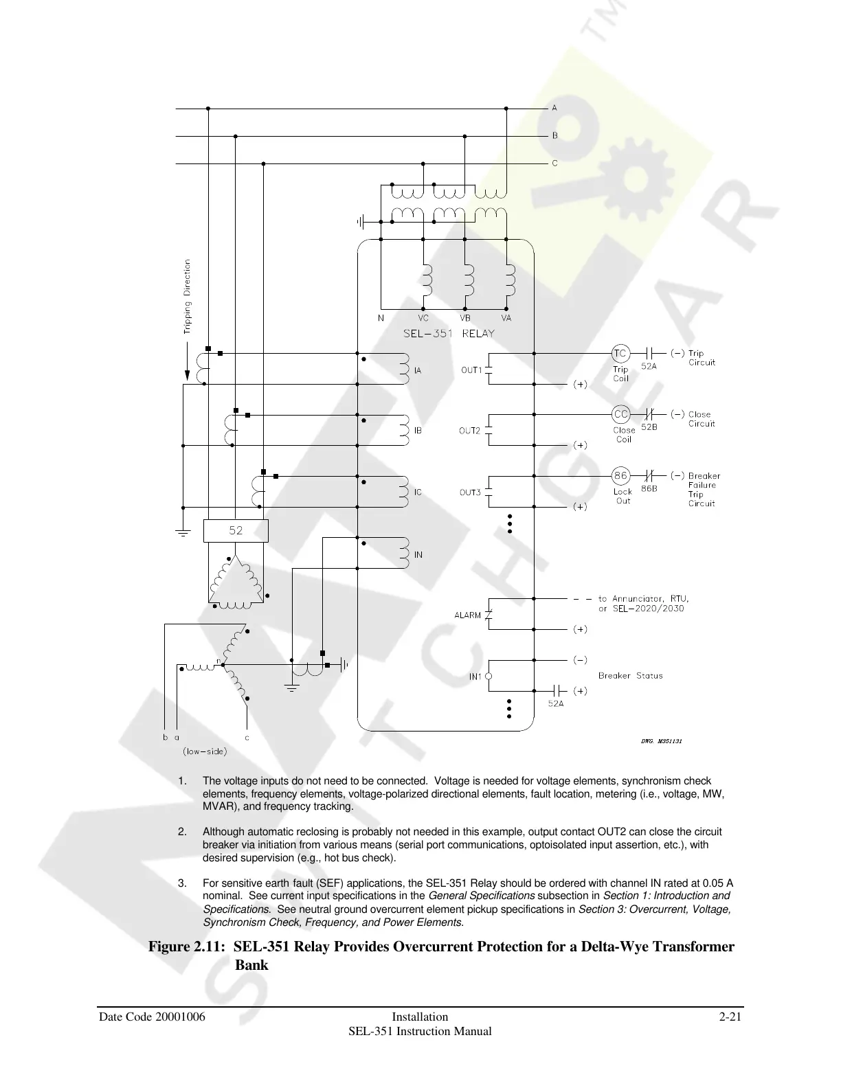 3. For sensitive earth fault (SEF) applications, the SEL-351 Relay should be ordered with channel IN rated at 0.05 A