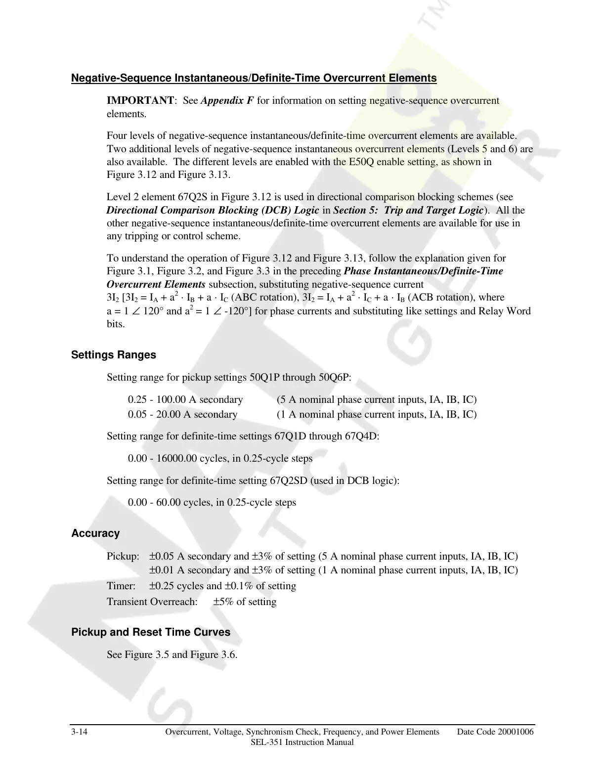 IMPORTANT: See Appendix F for information on setting negative-sequence overcurrent