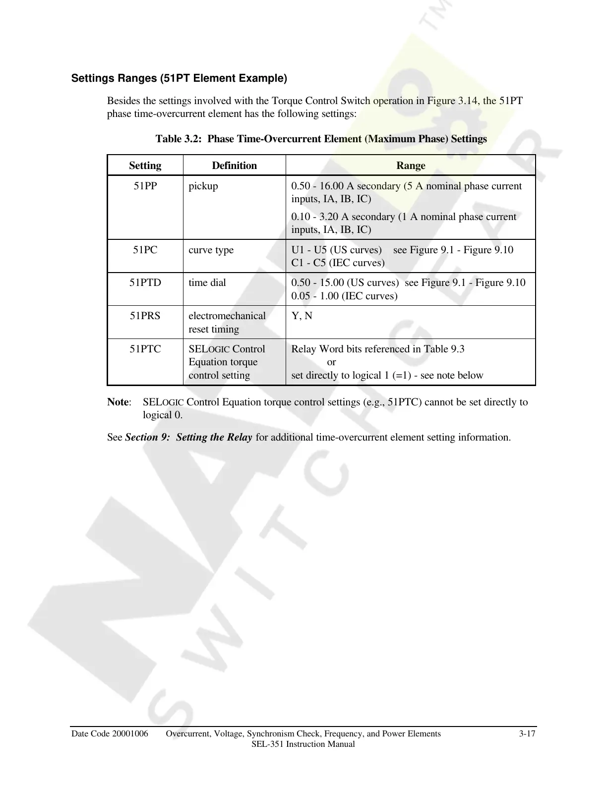 Date Code 20001006 Overcurrent, Voltage, Synchronism Check, Frequency, and Power Elements 3-17