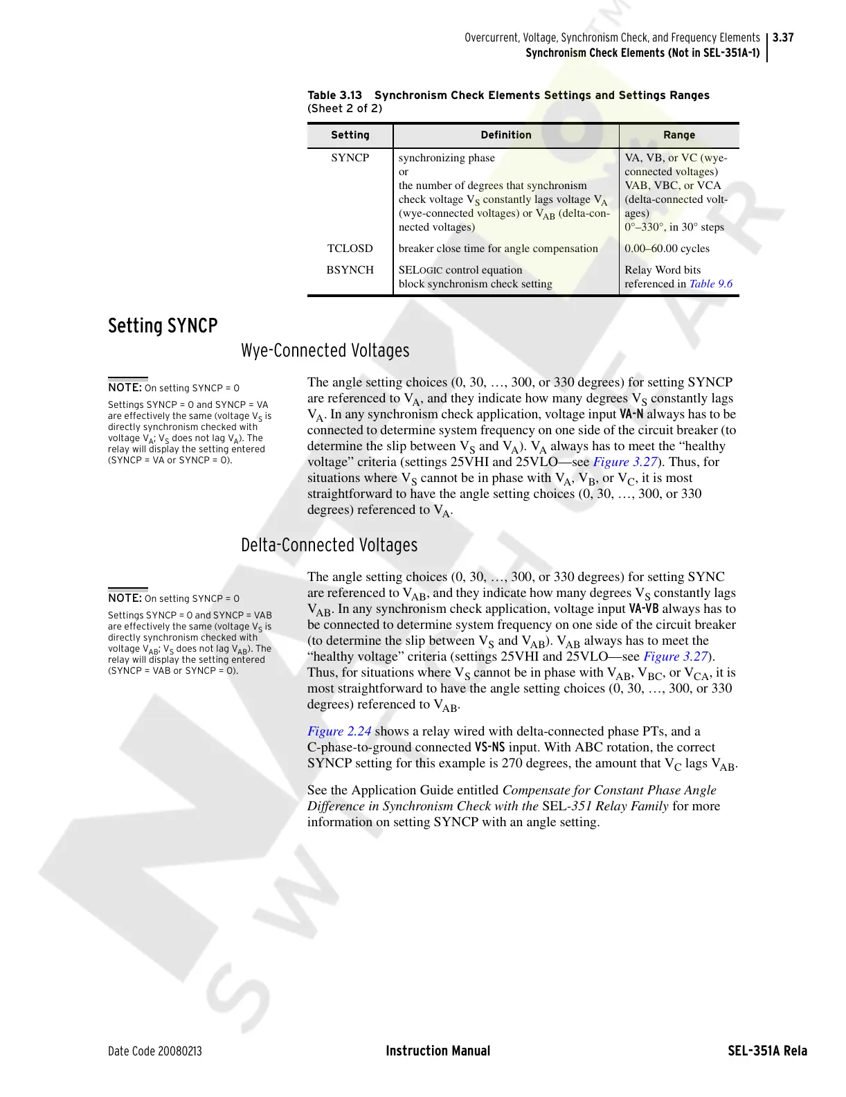 Table 3.13 Synchronism Check Elements Settings and Settings Ranges