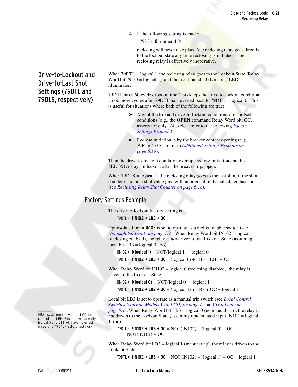 When 79DTL = logical 1, the reclosing relay goes to the Lockout State (Relay