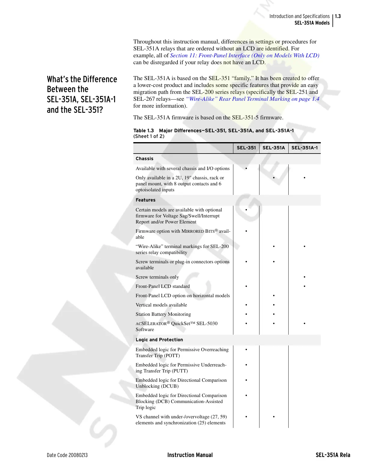 Table 1.3 Major Differences—SEL-351, SEL-351A, and SEL-351A-1