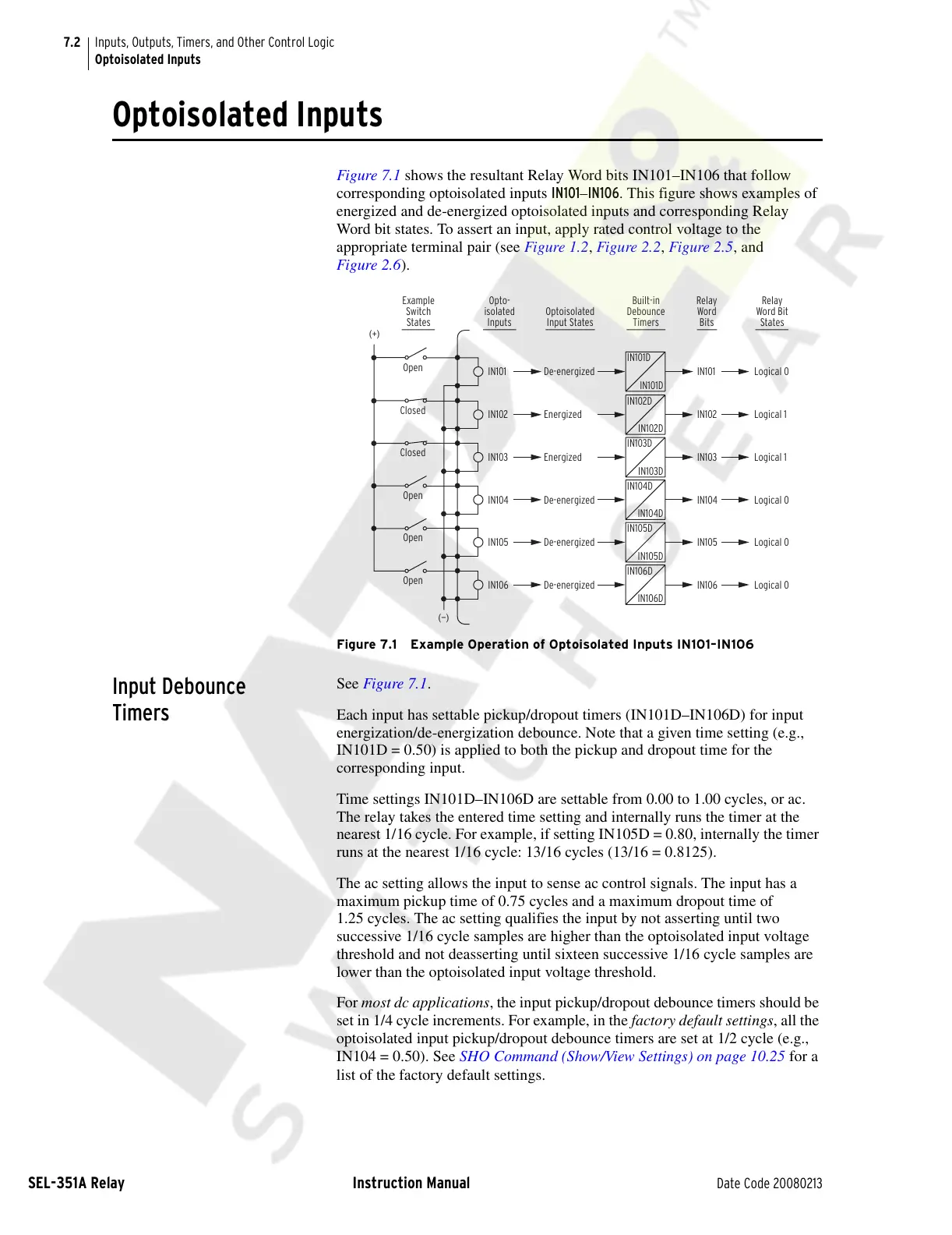 Figure 7.1 shows the resultant Relay Word bits IN101–IN106 that follow