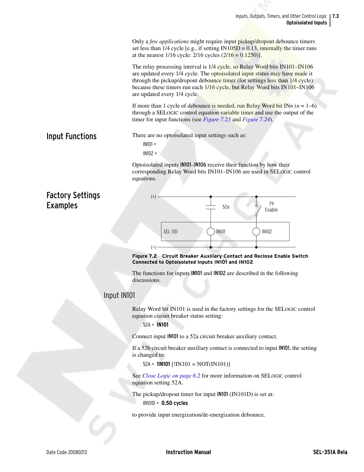 corresponding Relay Word bits IN101–IN106 are used in SEL