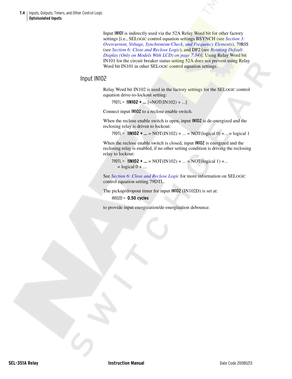 When the reclose enable switch is open, input IN102 is de-energized and the