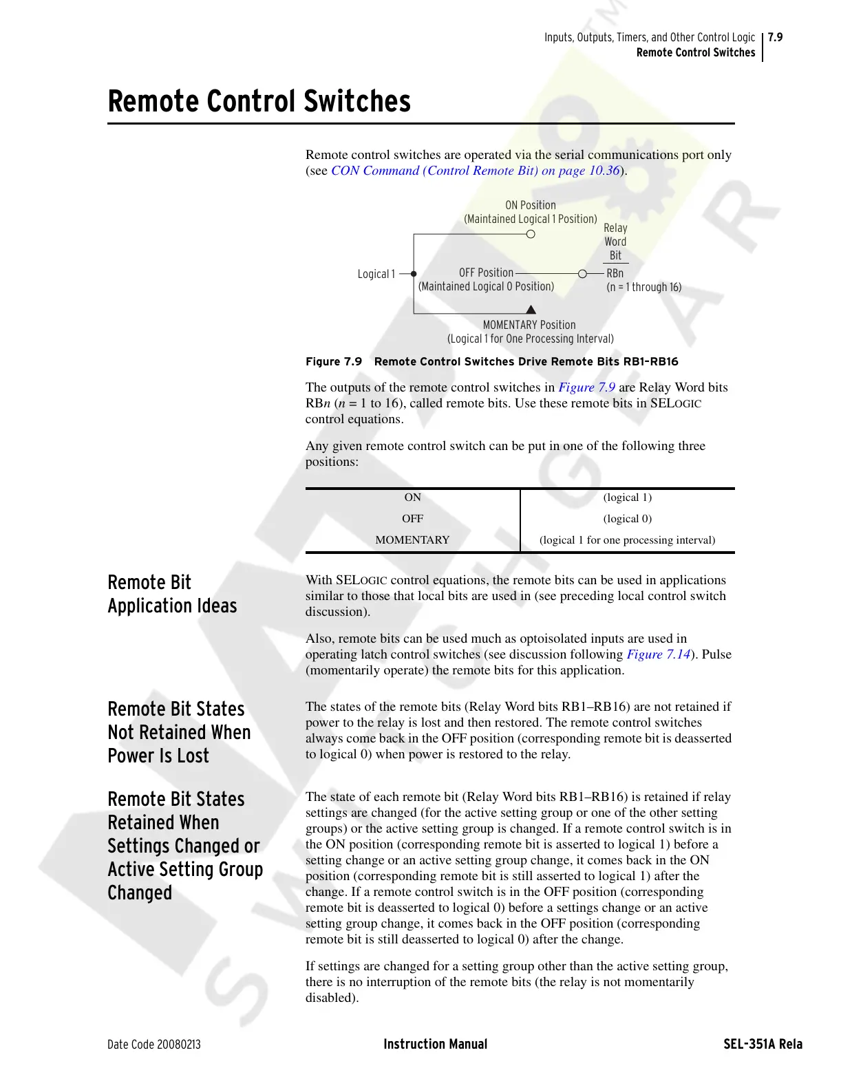 The state of each remote bit (Relay Word bits RB1āRB16) is retained if relay