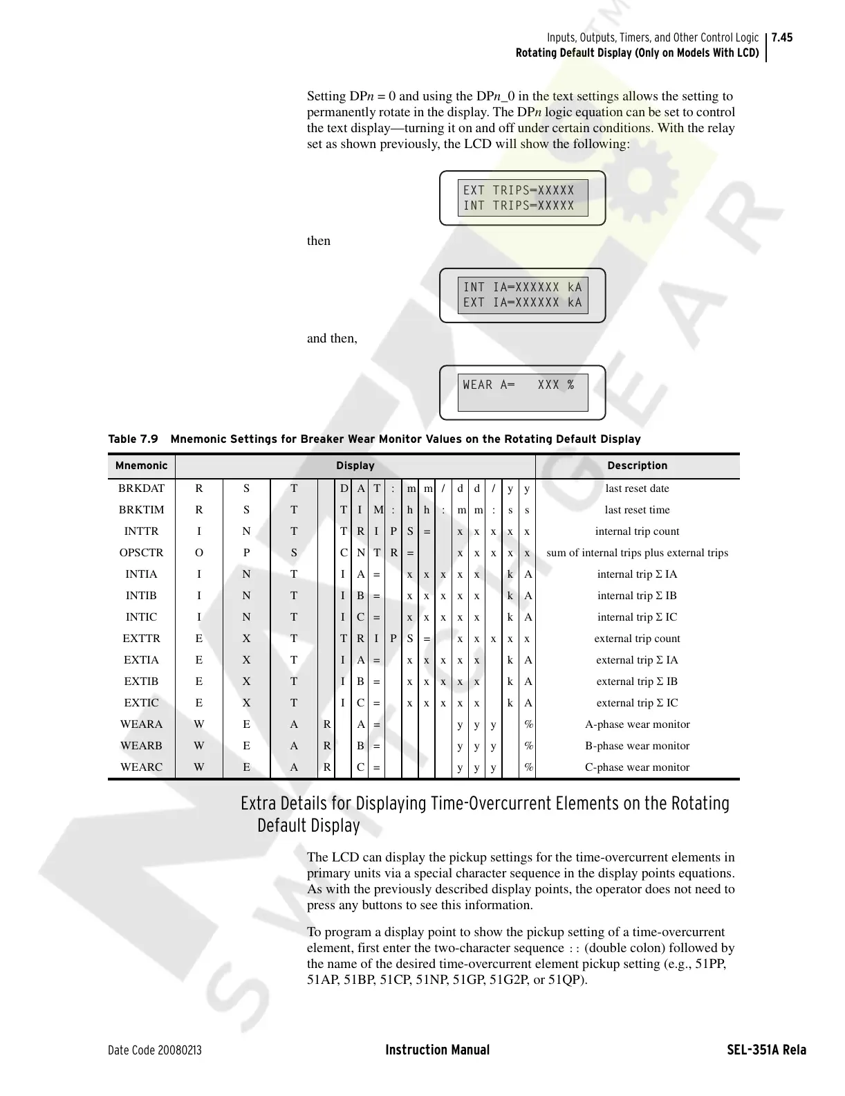 Table 7.9 Mnemonic Settings for Breaker Wear Monitor Values on the Rotating Default Display