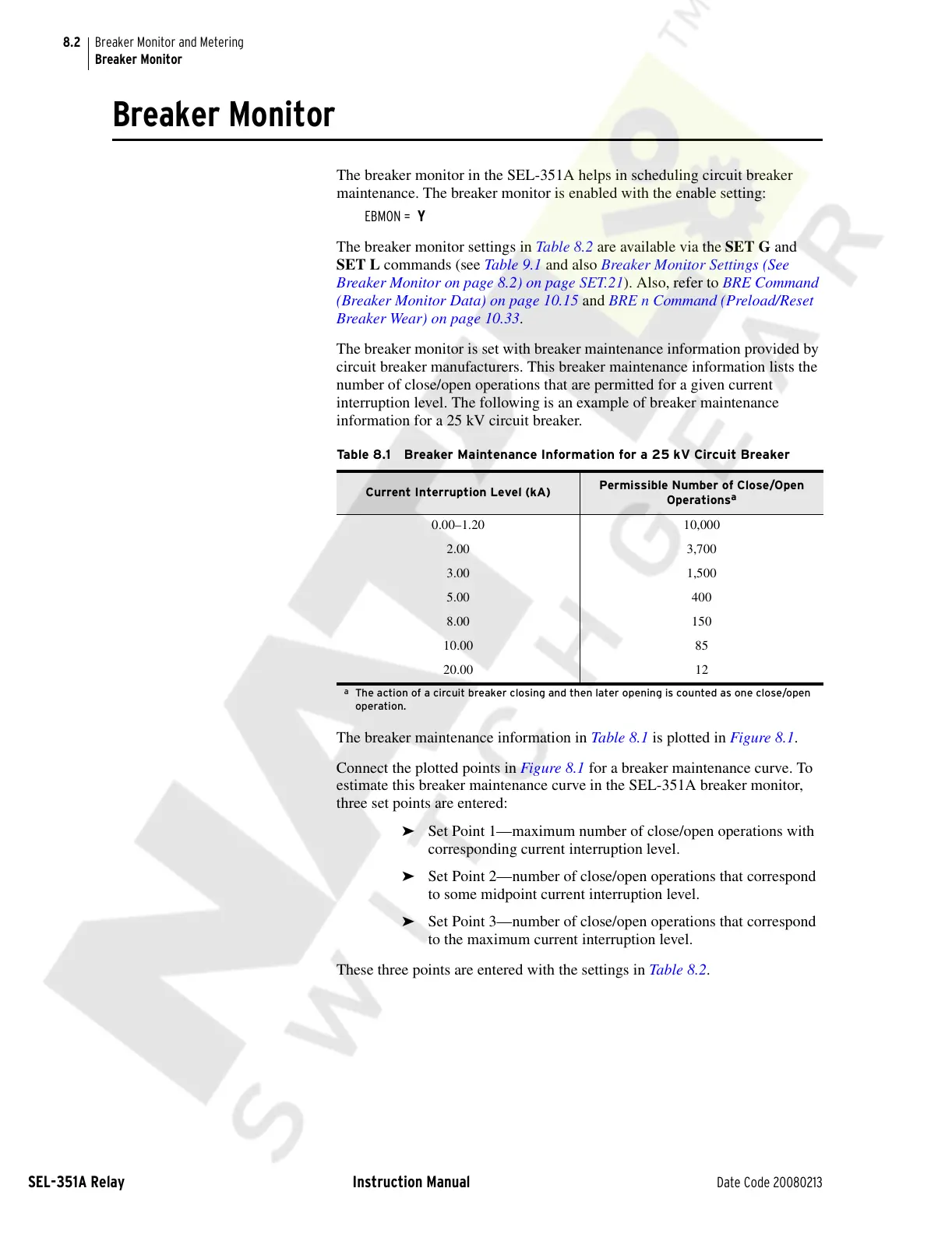 SET L commands (see Table 9.1 and also Breaker Monitor Settings (See