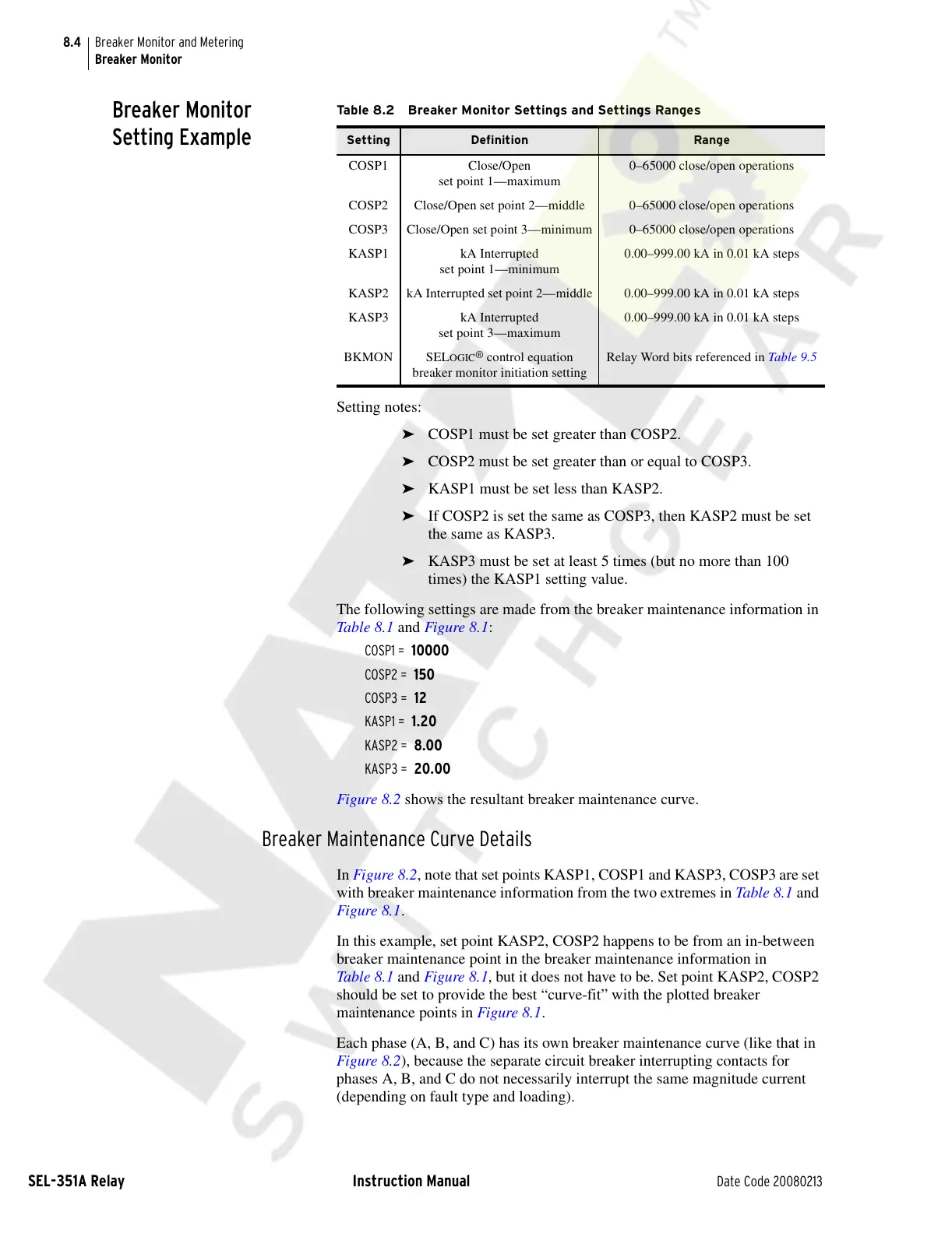 Table 8.2 Breaker Monitor Settings and Settings Ranges