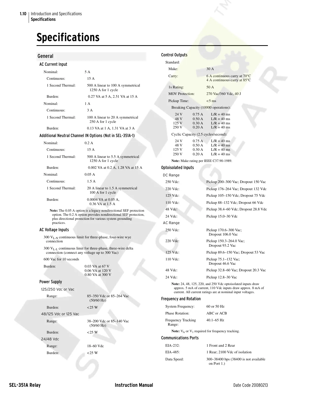 220 Vdc: Pickup 176–264 Vac; Dropout 132 Vdc