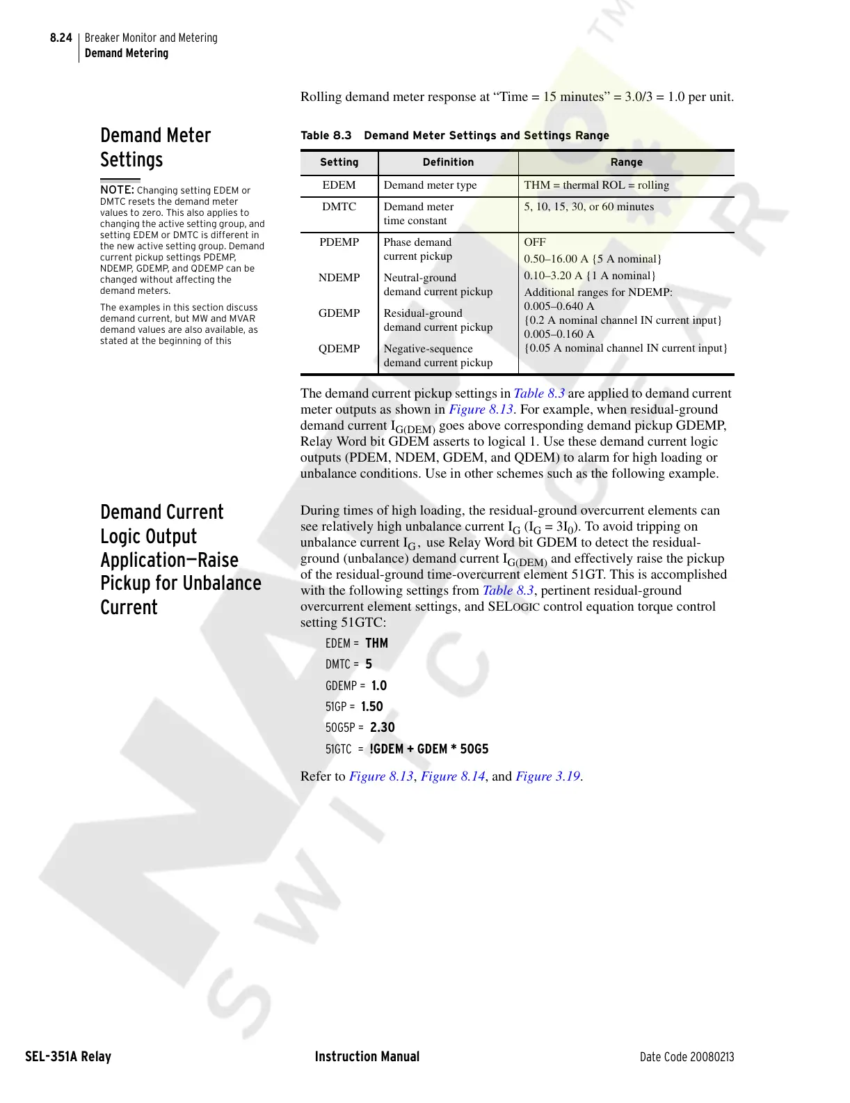 The demand current pickup settings in Table 8.3 are applied to demand current