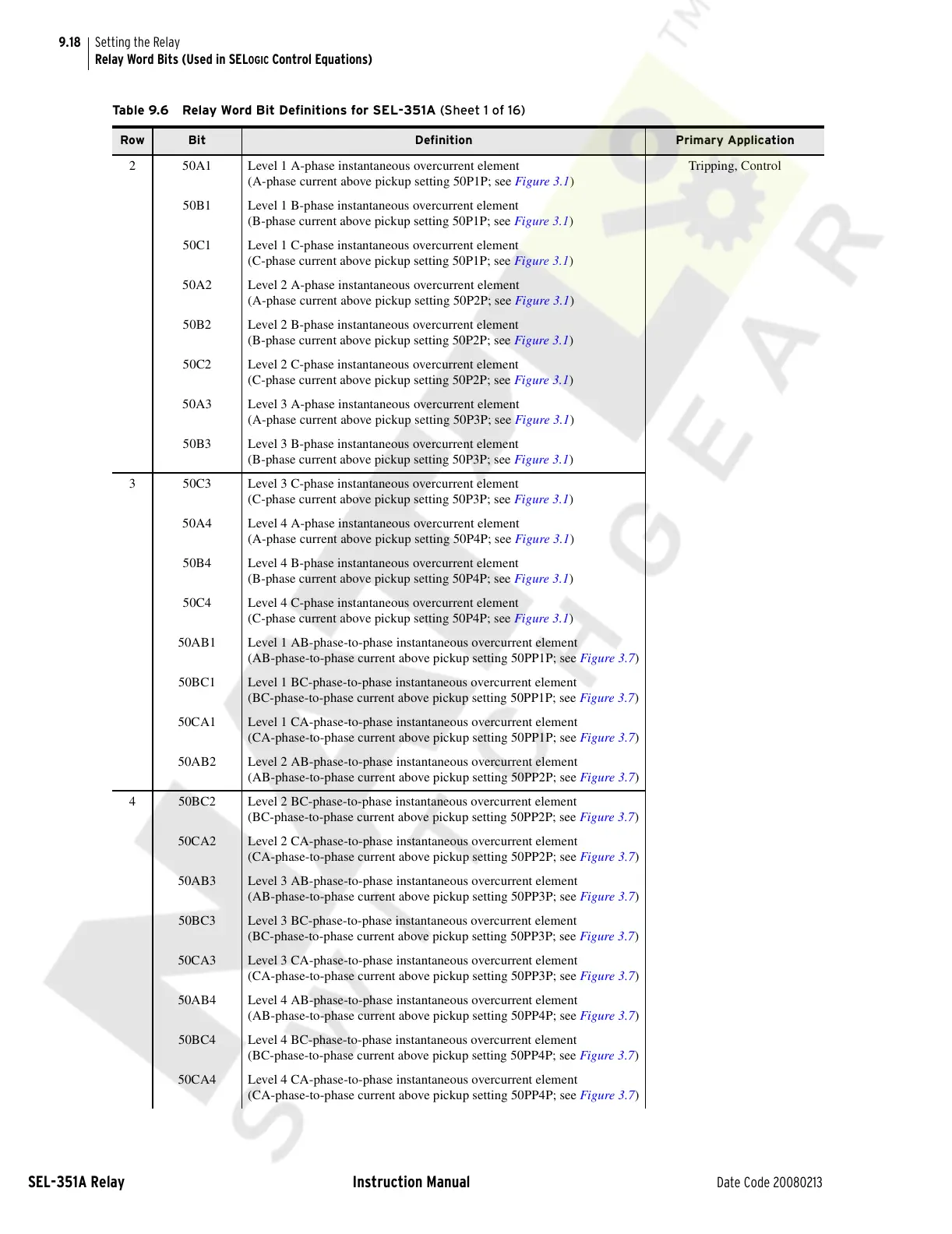 Table 9.6 Relay Word Bit Definitions for SEL-351A (Sheet 1 of 16)