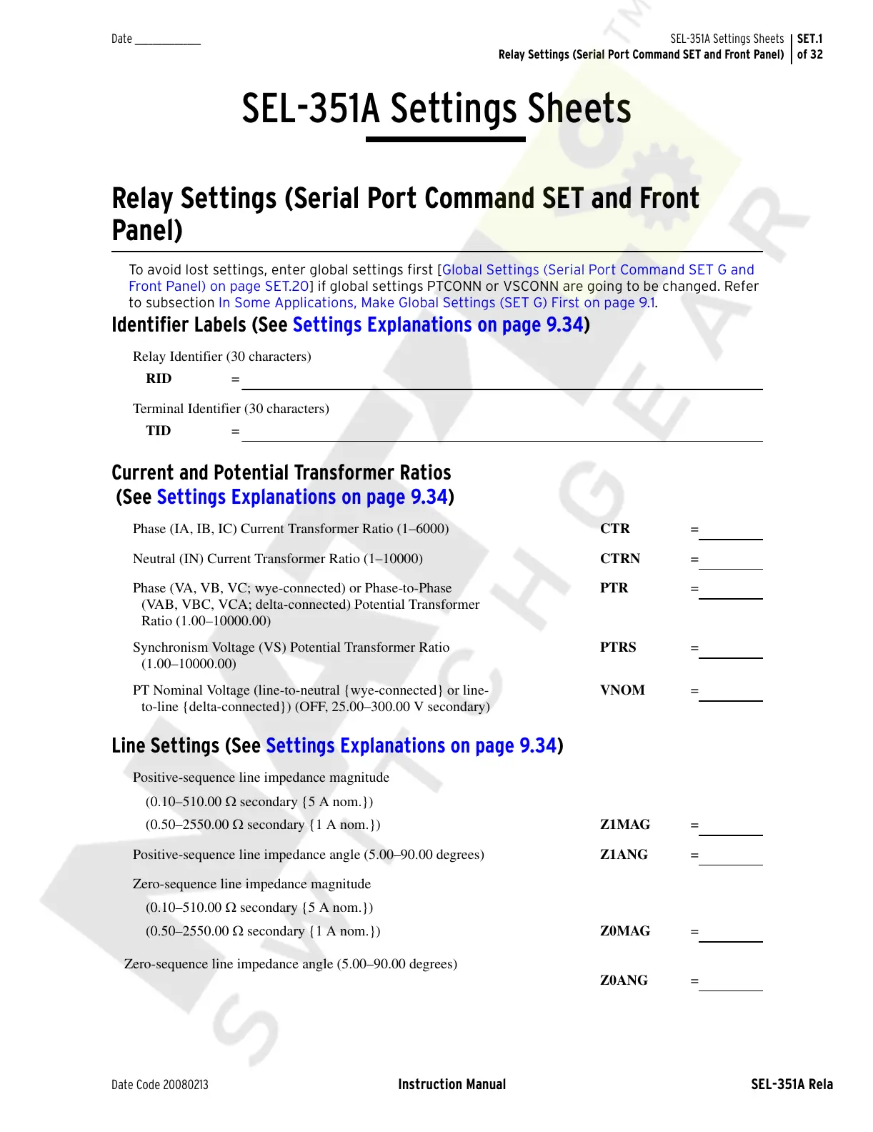 SEL-351A Settings Sheets