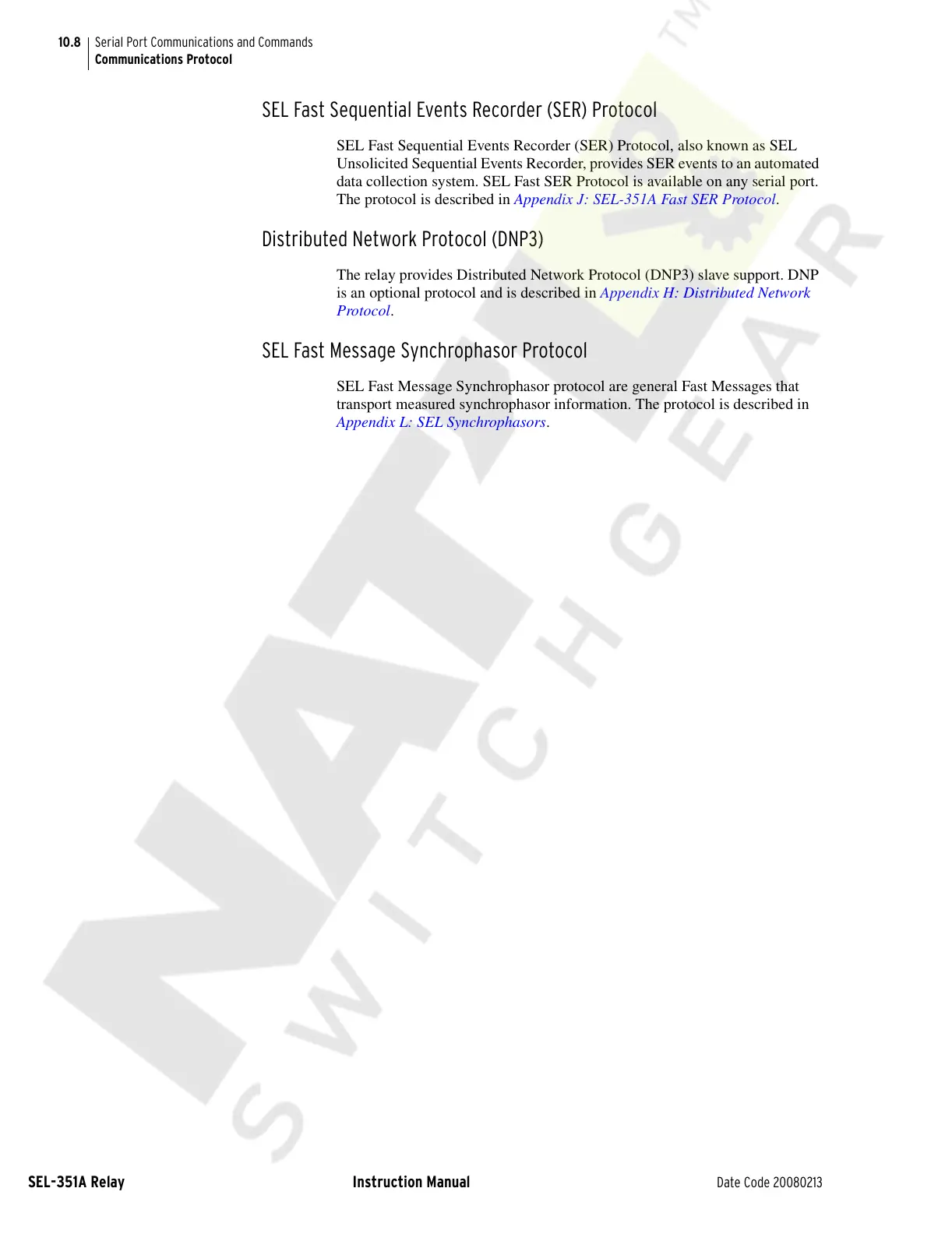 The protocol is described in Appendix J: SEL-351A Fast SER Protocol.