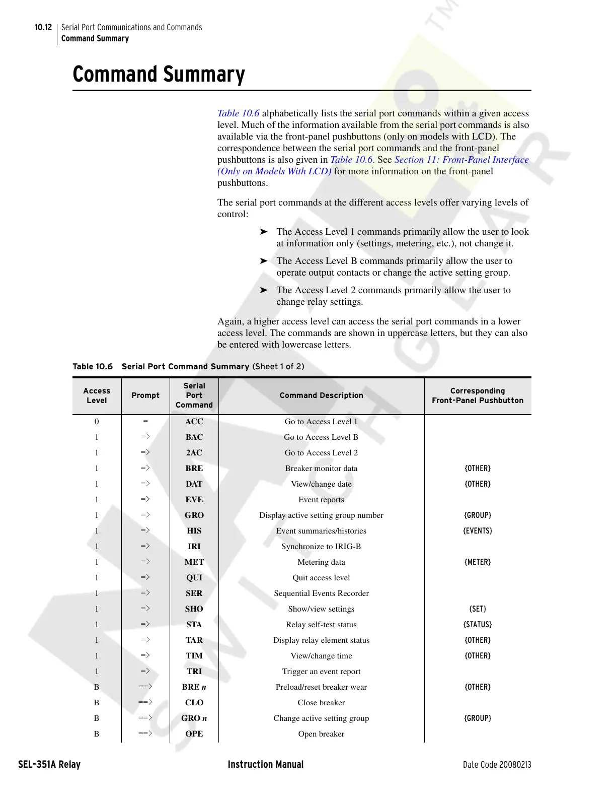 Table 10.6 alphabetically lists the serial port commands within a given access